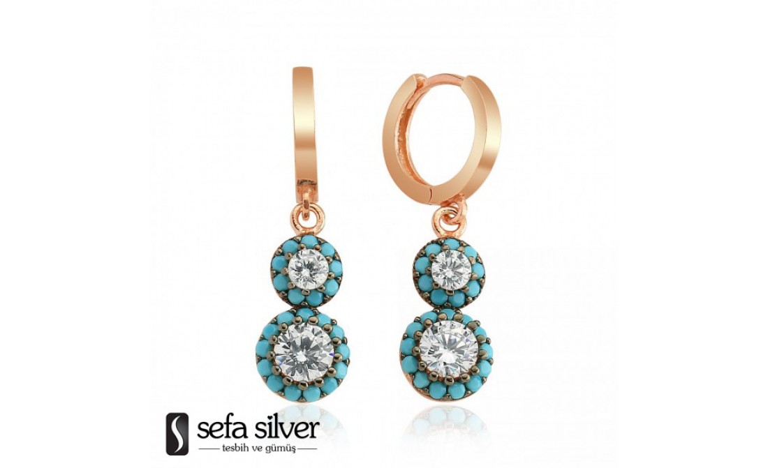 Halkaların ortasında bir adet zirkon taş ve taşları çevreleyen firuzeleri küpemizde süsleme olarak görmektesiniz.