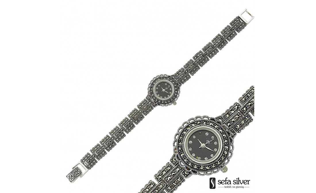Markazit taşlarının sık kullanılmasıyla tasarlanmış harika bir gümüş saat modeliyle karşı karşıyayız.