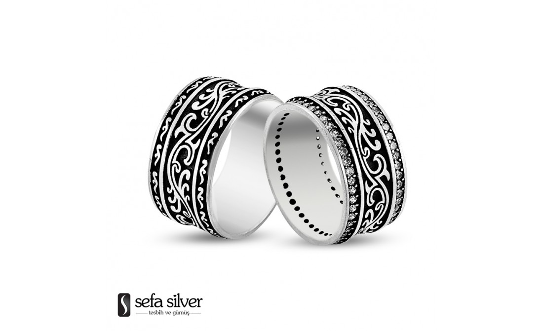 Fotoğrafta görmüş olduğunuz çift alyans modelimiz 925 ayar gümüşdür. Erkek yüzüğümüz taşsız olup bayana ait olan yüzük modelimiz zirkon taşlarla çevrilidir. Taşlar yapıştırma olmayıp tırnaklıdır bu sayede taşların düşme olasılığı azdır. Gümüşün üzeri siyah oksitlenerek mat bir görünüm elde edilmiştir.